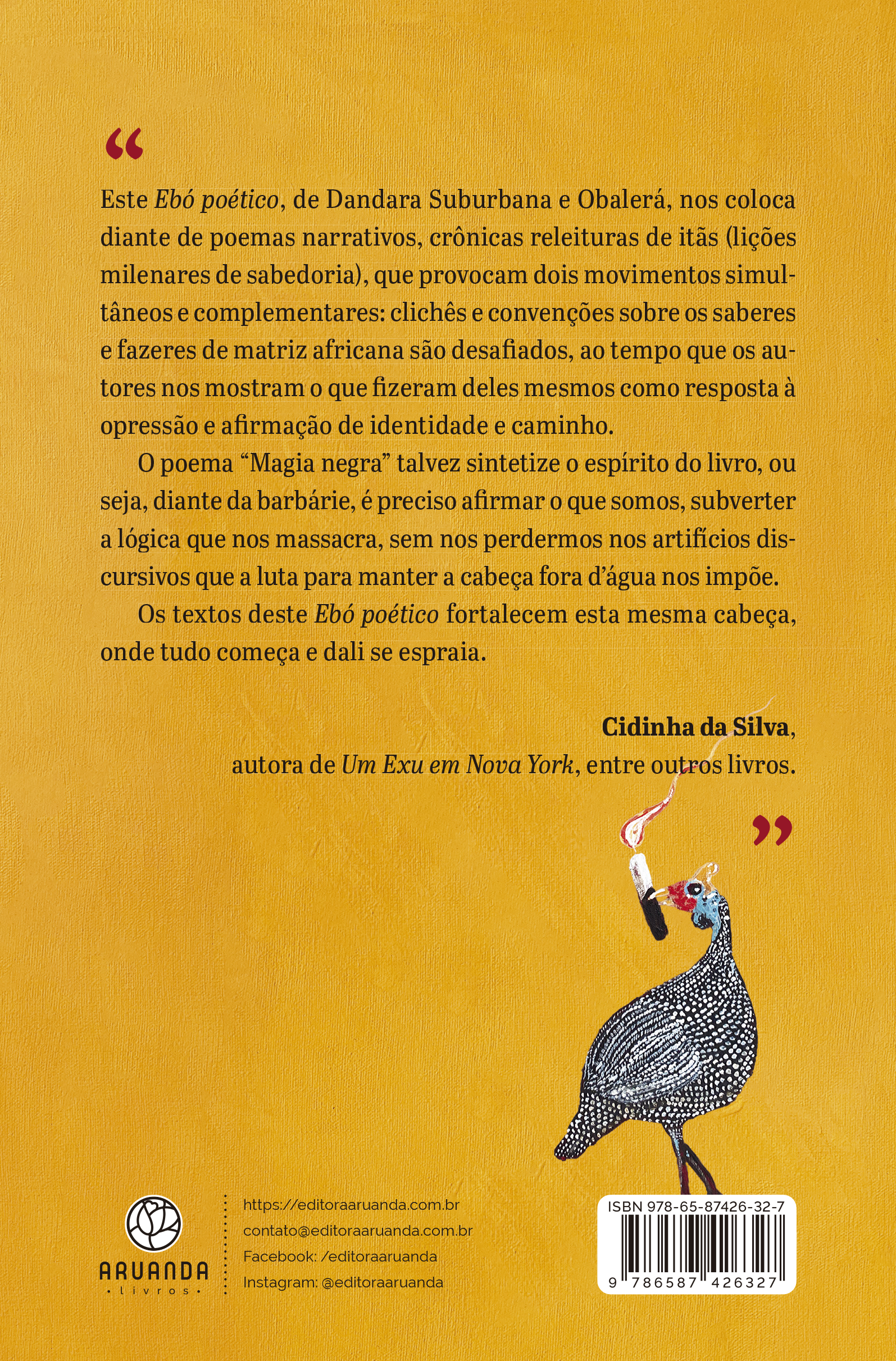 Entre punhais e rezas, folhas e gargalhadas, Ebó poético ergue uma travessia coletiva, construída com o afeto radical de quem escreve com o corpo, com a fé e com a memória. É livro que se dança, se canta, se sente. É palavra de axé, cura, caminho e descolonização. É amizade feita de oriki, escrita como banquete partilhado. Um chamado para lembrar, celebrar e transformar — porque sem cura, não há justiça; e sem justiça, a cura é apenas silêncio.